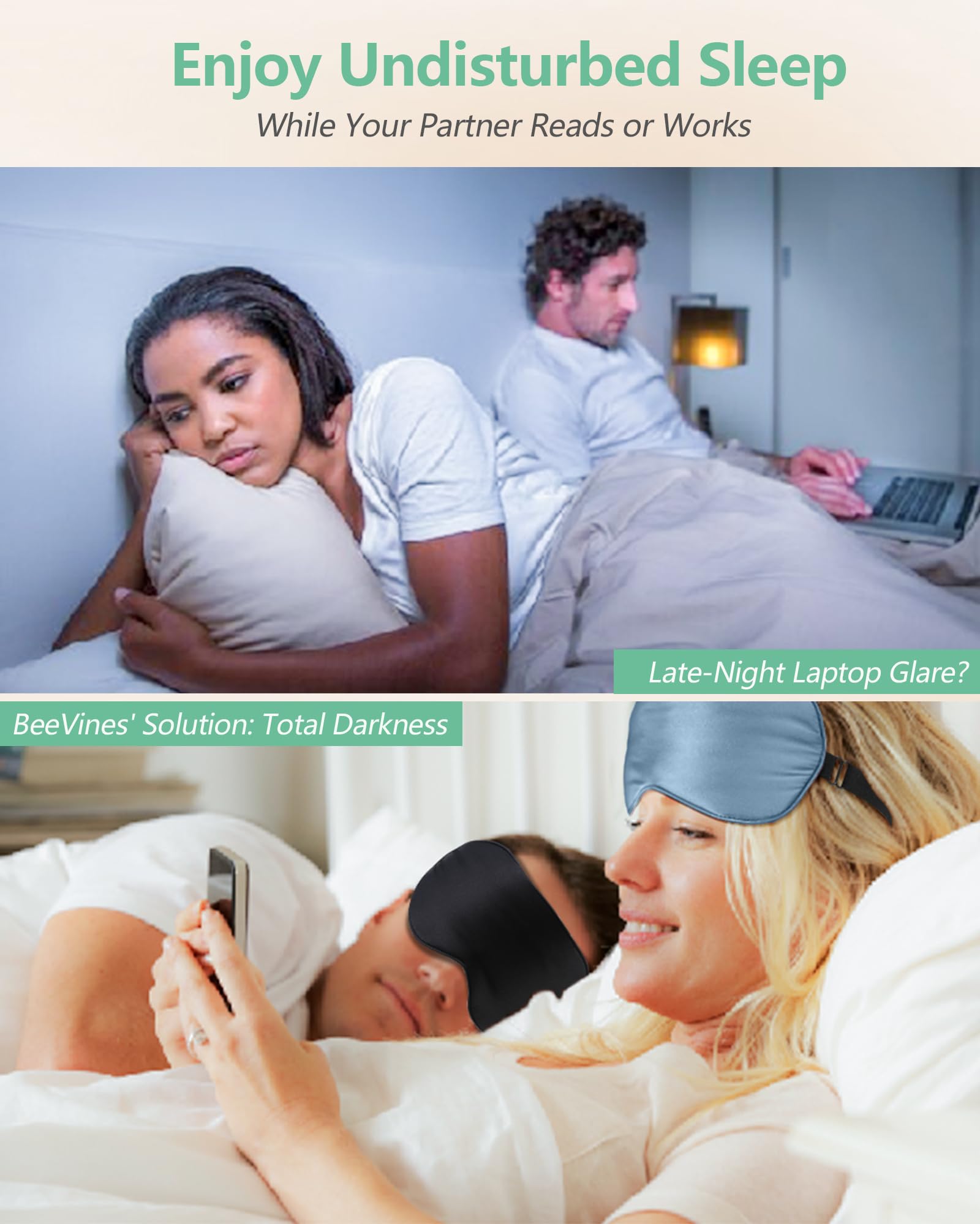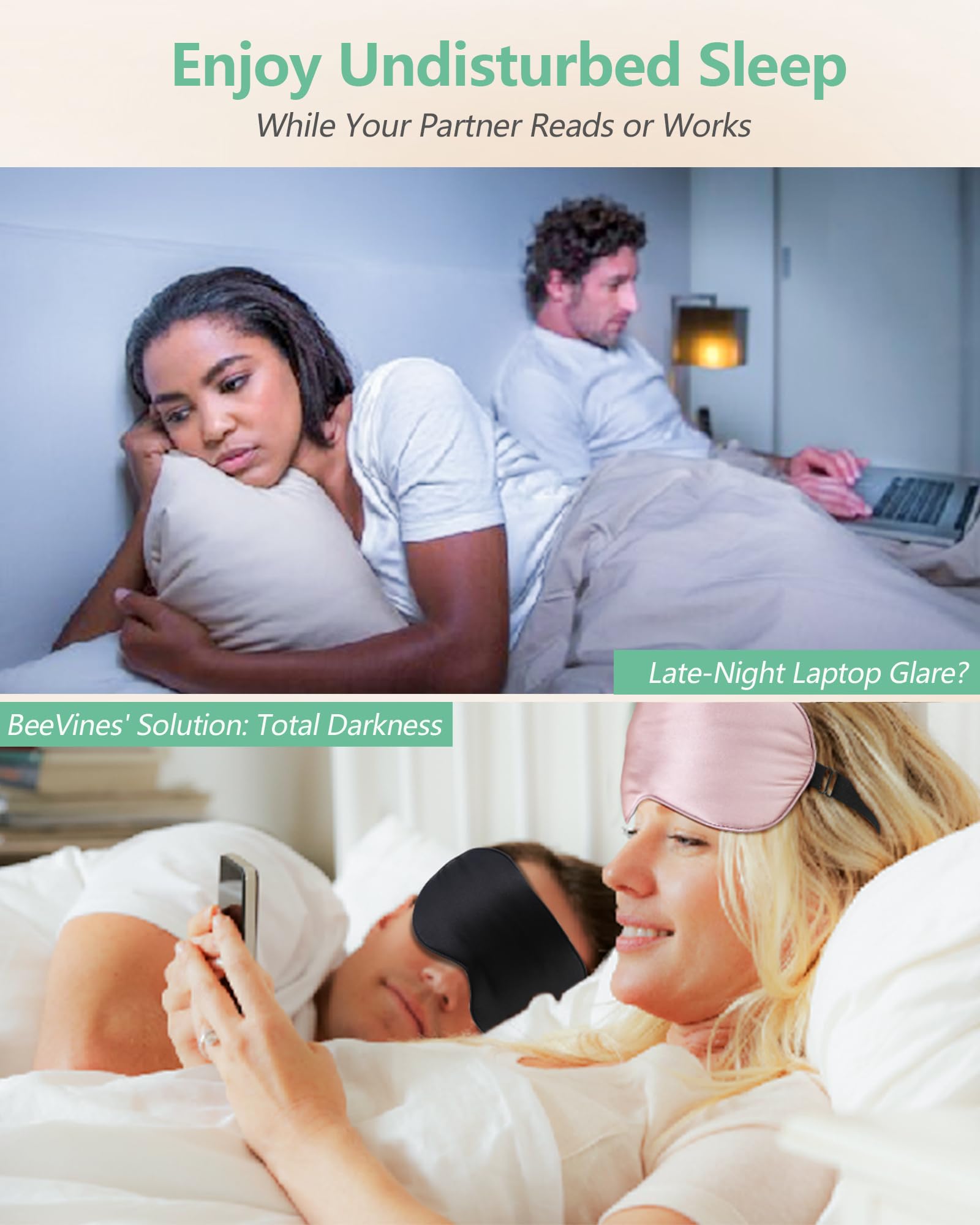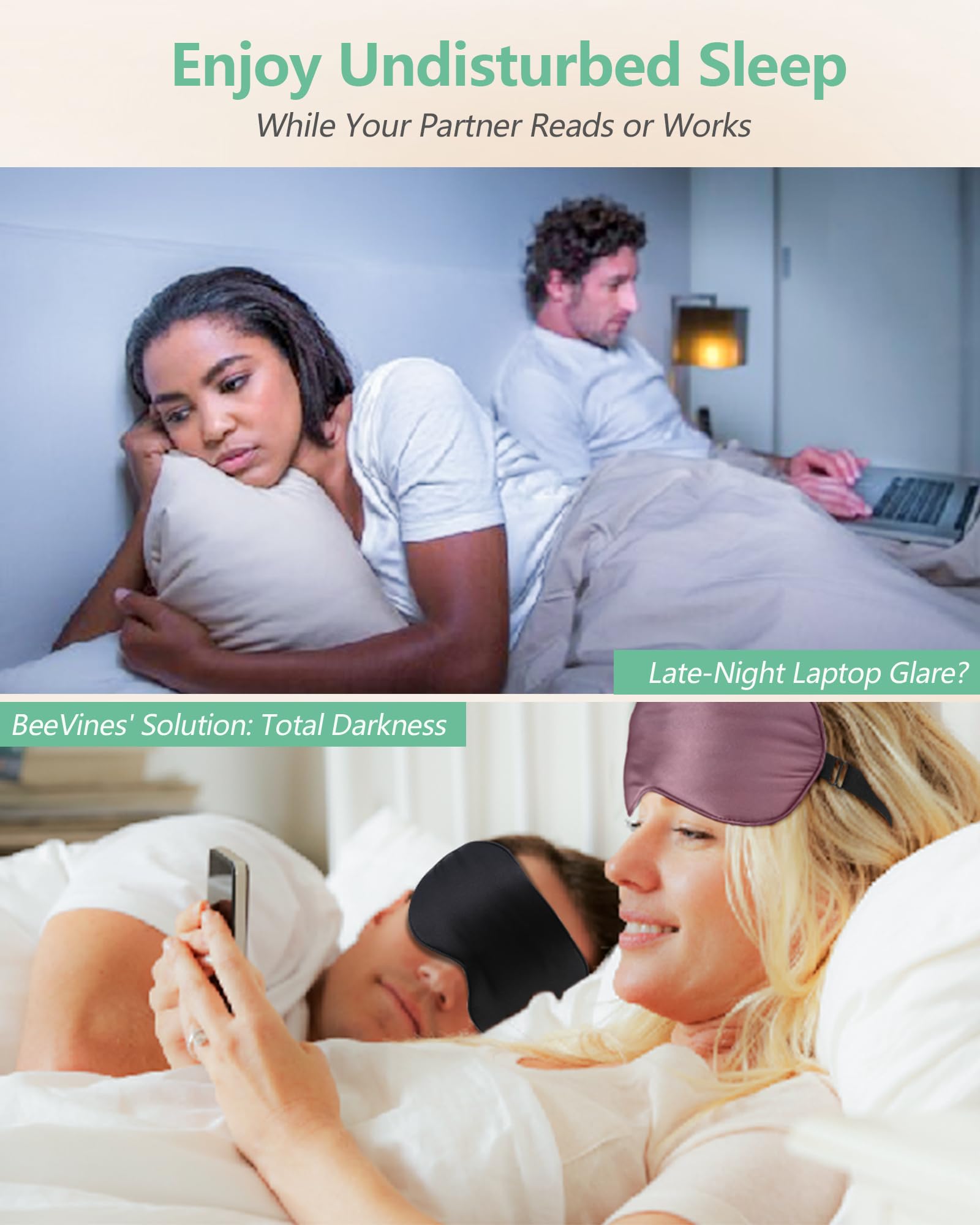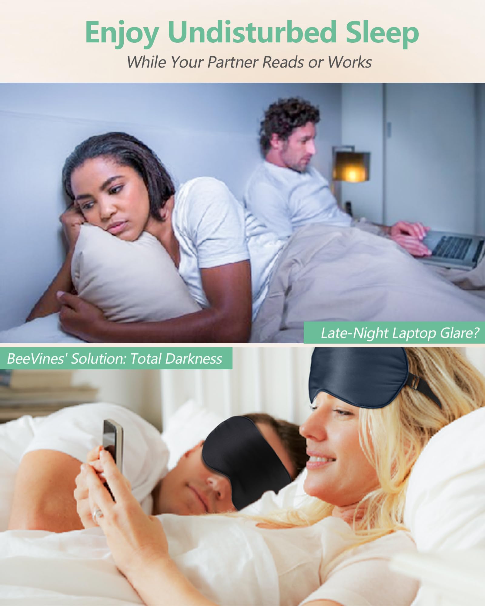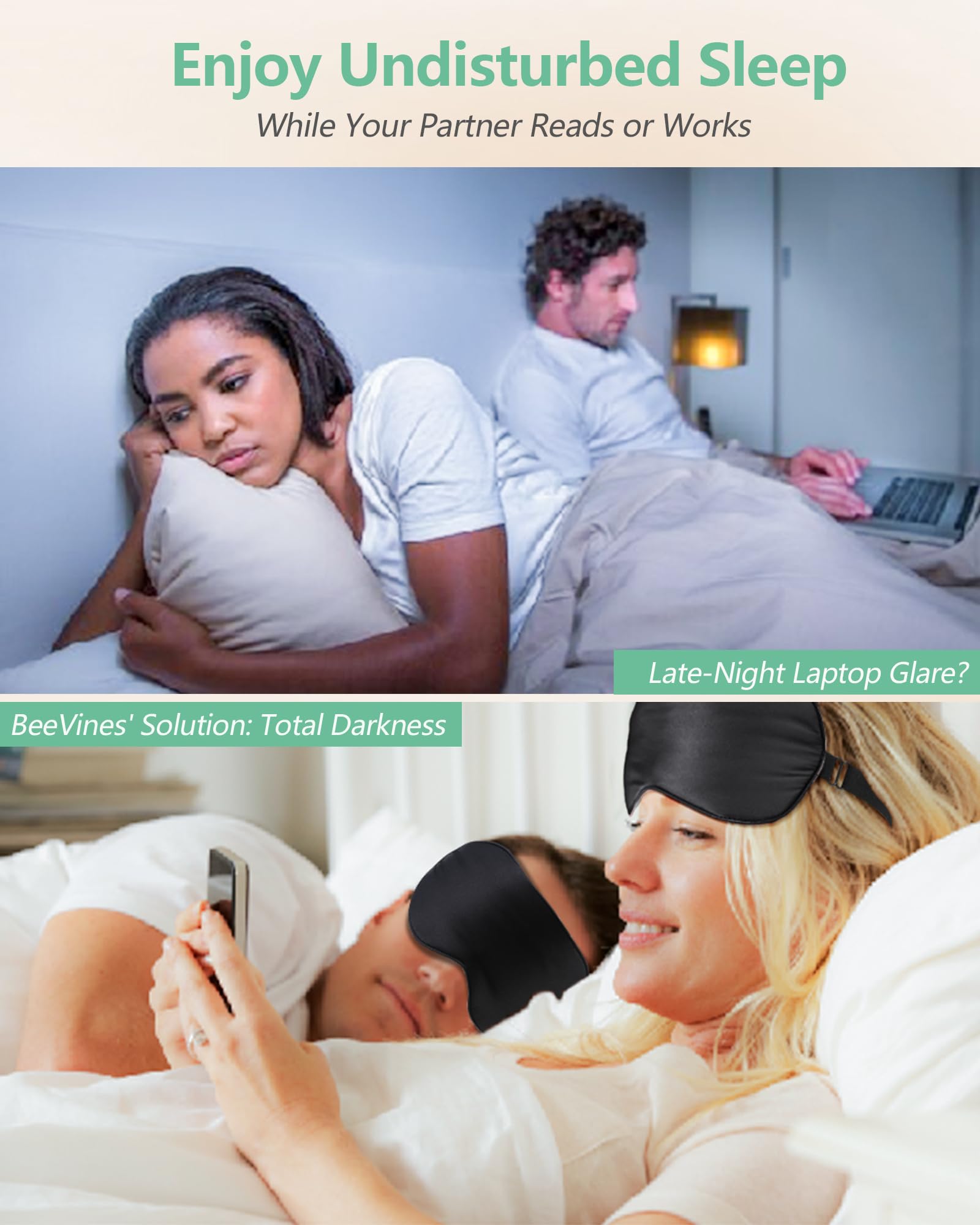 - Blink at Ease & Enjoy Sound Sleep in Any Position: BeeVines night sleep mask for men, women & kids is specially designed for rub-minimizing comfort. Both sides are made of pure mulberry silk, our eye masks for sleep cover will keep your eyes shielded from annoying light without compressing your nose bridge, eyelids or temples while sleeping. The adjustable pain-free strap of our blackout eye mask is specifically designed to be adjusted flexibly to allow you to sleep comfortably in any position.