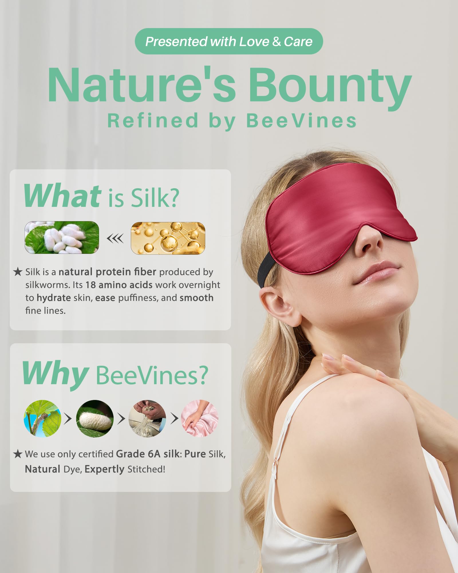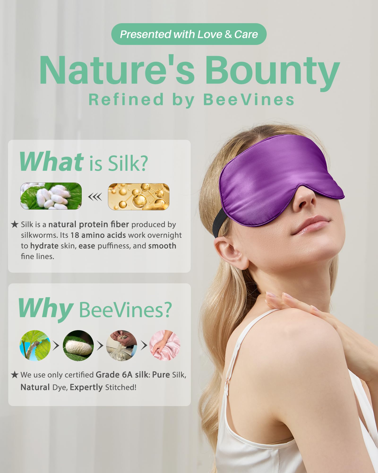 - BeeVines 100% Real Mulberry Silk Eye Mask, Enhanced Sleep & Lifted Spirit: Our real silk sleep mask for women, men & kids naturally relieve tension & improve mood through a peaceful full night’s sleep. Our both sides 100% silk eye masks for sleep are naturally breathable & calming to your facial skin to deliver a faster and sweeter sleep while keeping your eyes relaxed and 100% blackout. BeeVines Sleeping Mask, 100% Mulberry Silk Tested, Not Made of Satin Silk/Not Fake Silk!