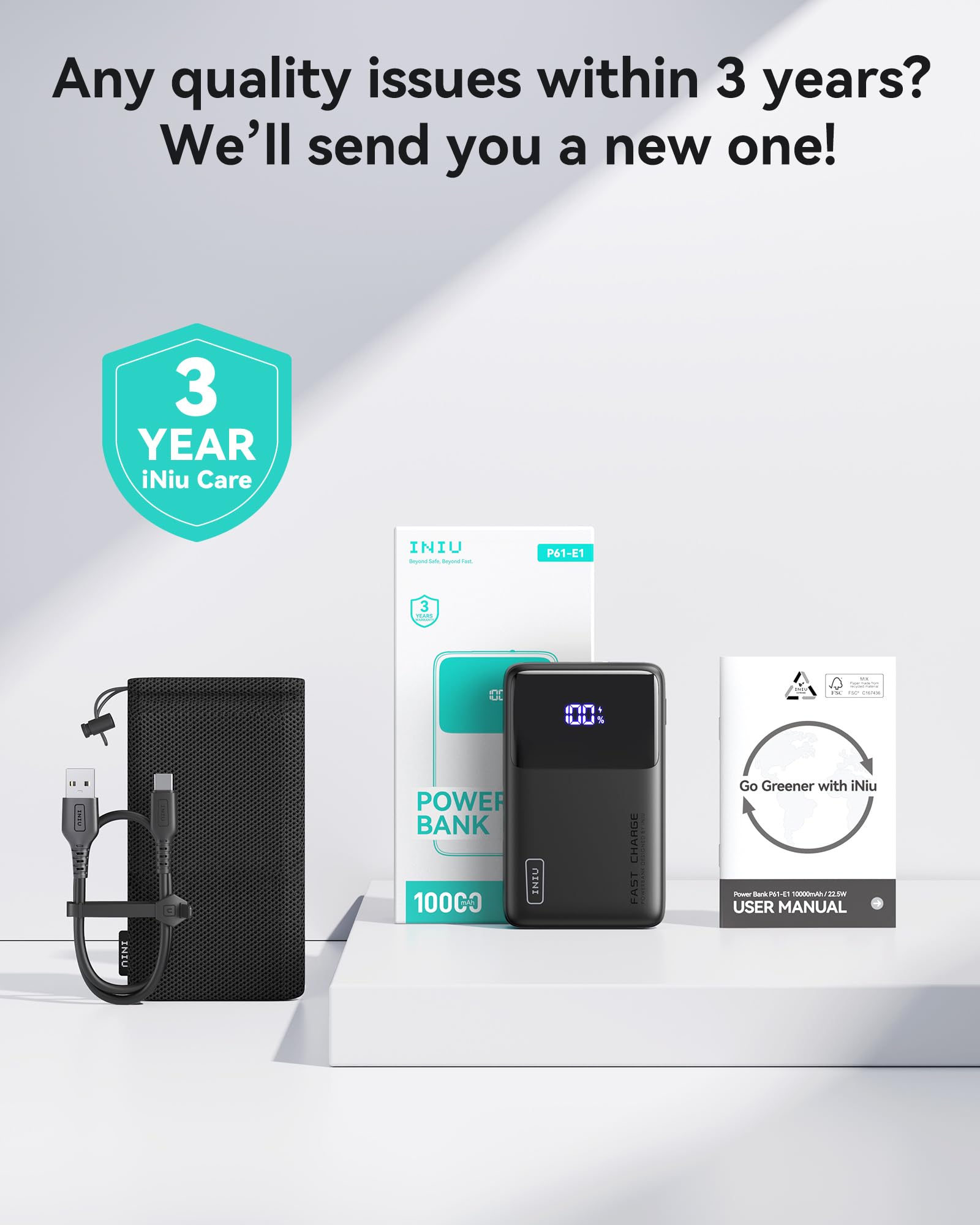 - ✅【What You Get】INIU 10500mAh fast charge portable charger*1, USB C cable*1, travel pouch*1, user manual*1, , INIU industry-leading 3 years INIU care and lifetime technical support