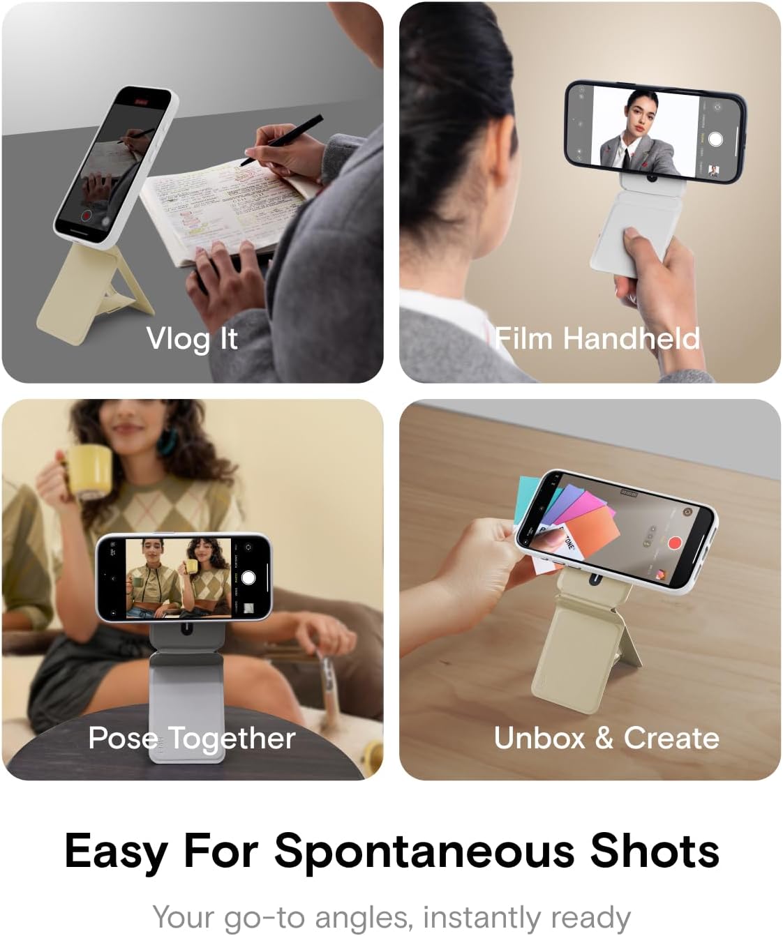 - Quick Setup & Ultra-Portable: Inspired by origami, this foldable phone tripod transforms from a slim card into a full phone tripod in seconds—no screws, loose parts, or assembly needed! At just 3oz, it’s the most compact and travel-friendly phone stand, easily carried in your bag or attached to a MagSafe case. Perfect for content creation and hands-free viewing: ideal for Self-vlogging, group vlogging, outdoor photography, video calls, browsing, online classes, or fitness.