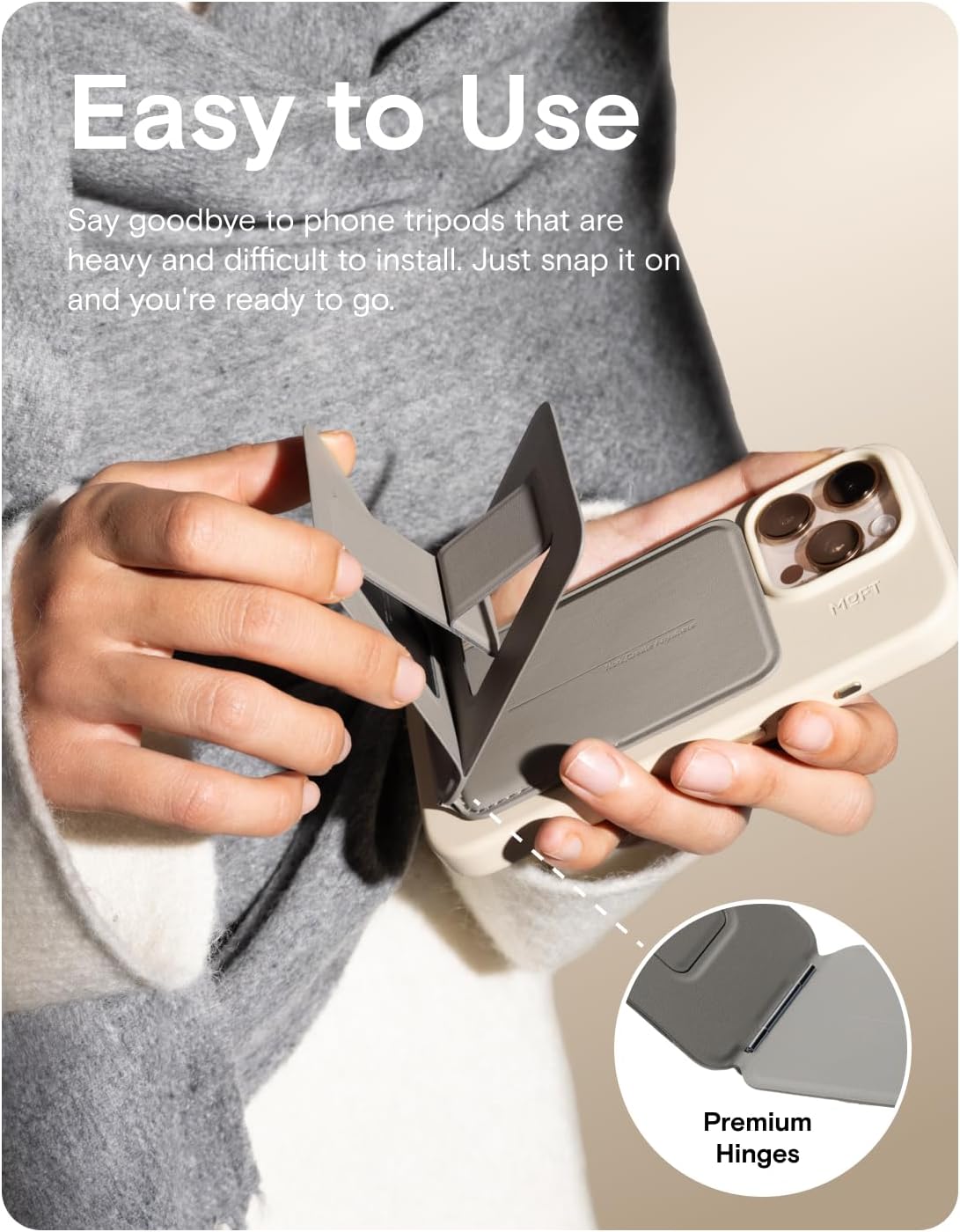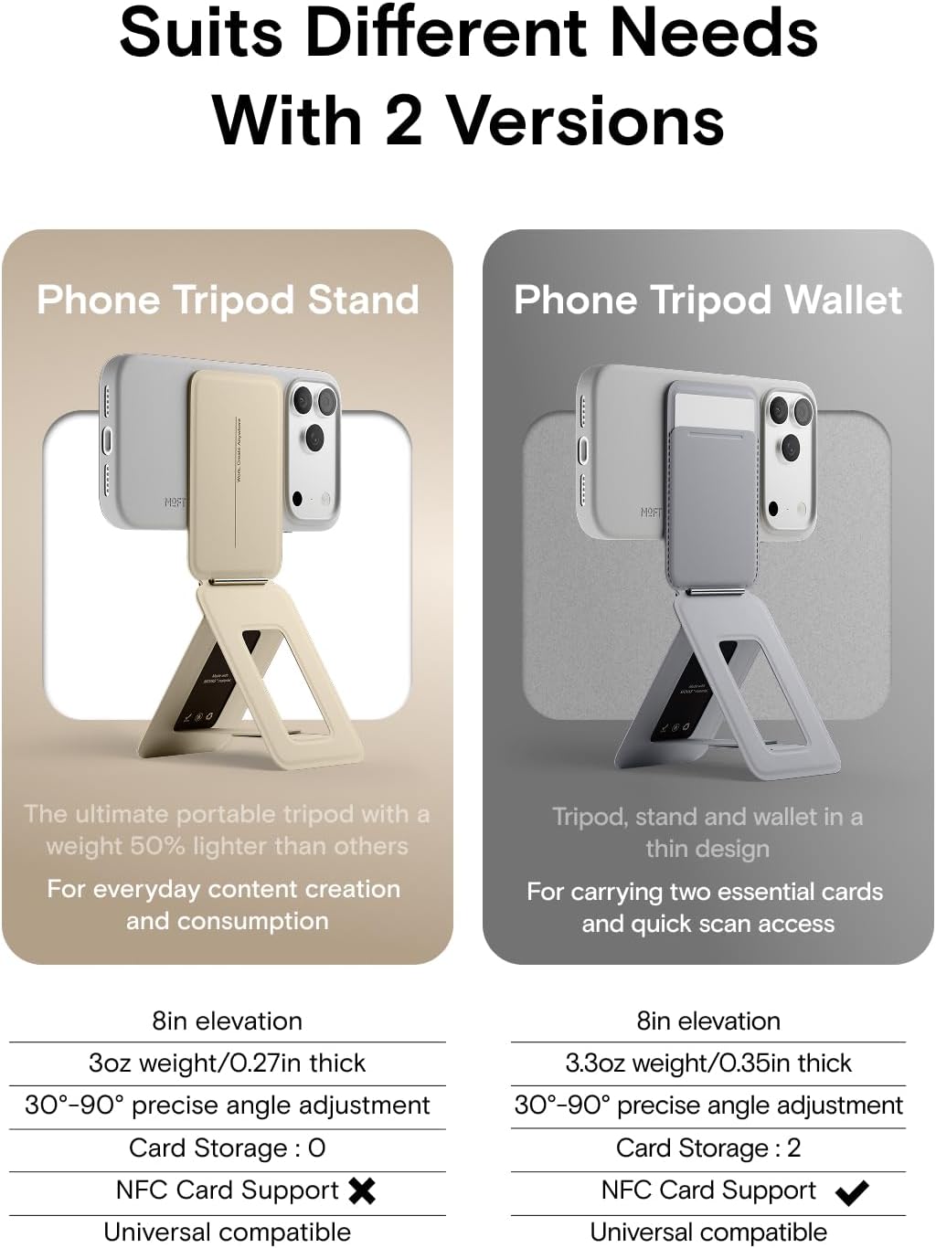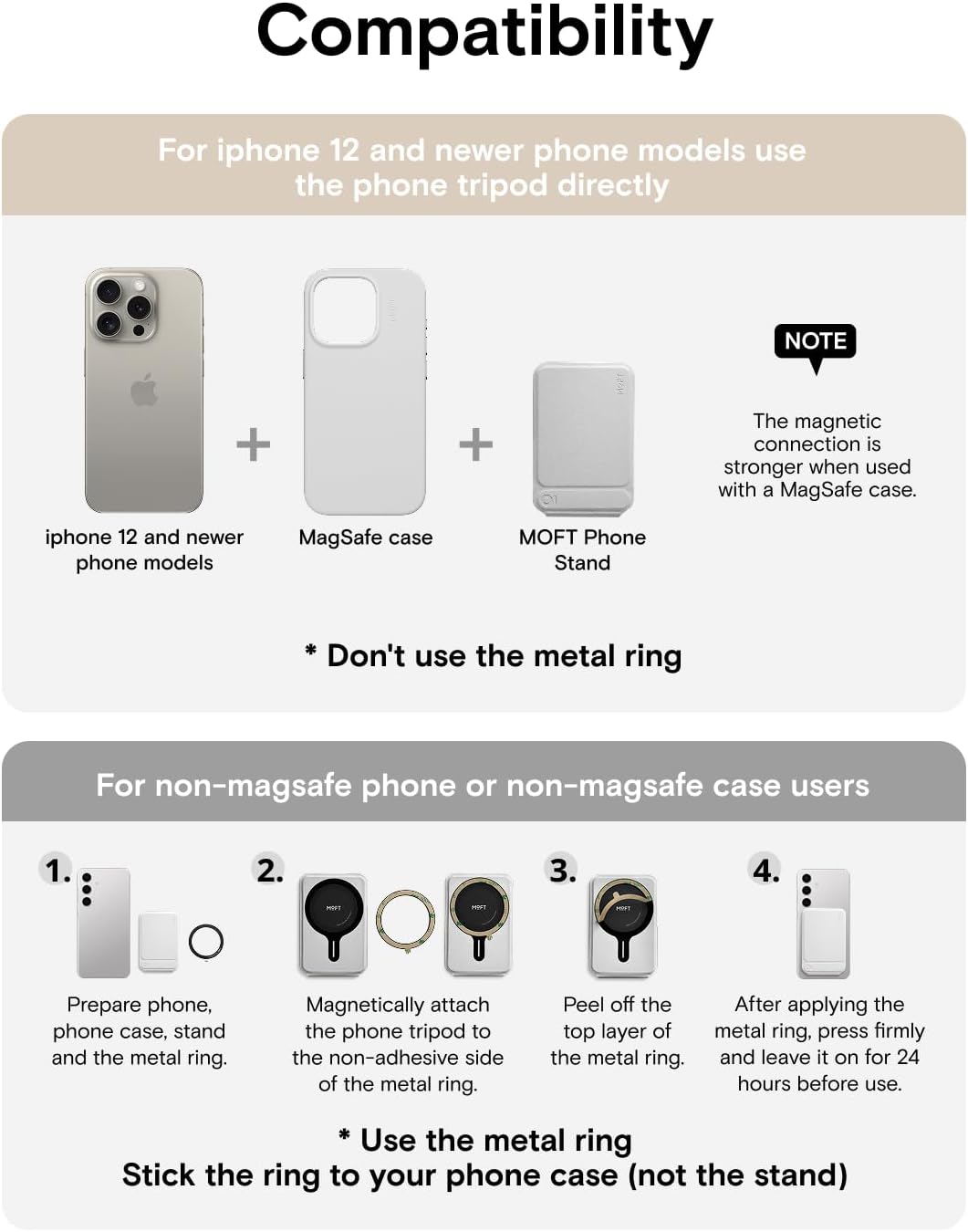 - Universal Compatibility: MOFT Phone Tripod fits iPhone 17/16/15/14/13/12 series and MagSafe cases. For other devices (such as Samsung) and non-magnetic cases, the phone stand can be attached using the included metal ring. Please check the product dimensions (3.8in X 2.5in X 0.27in) to ensure it fits the back of your phone without obstructing the camera. The slim design ensures your phone’s lenses stay unobstructed-perfect for Instagram-worthy shots at cafes, parks, or business events.